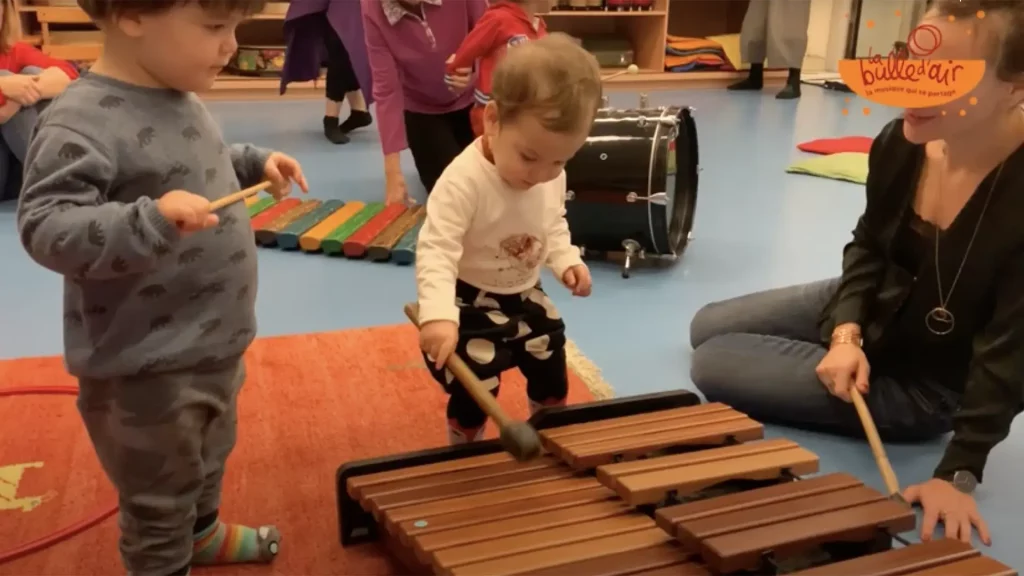 Accompagné d’un adulte, les petits partagent le plaisir de chanter et de jouer avec leur corps, accompagné de petits instruments.